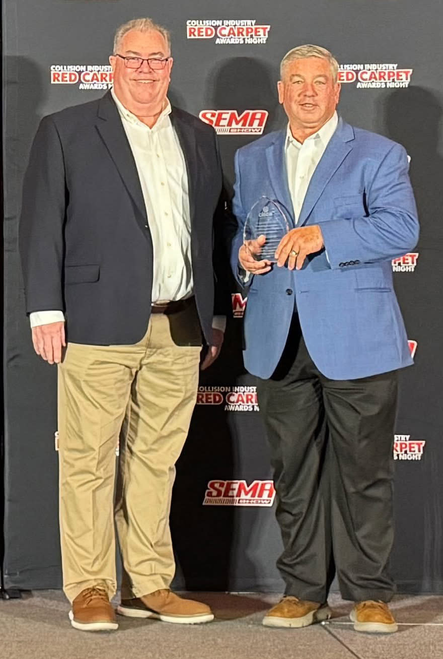 NORTH RICHLAND HILLS, TEXAS, November 12, 2025 - Paul Barry, Executive director, (left) of CIECA and Roy Schnepper, AMAM, Butler’s Collision, Roseville, MI, (right) and recent past chairman of the Automotive Service Association (ASA) received the Lifetime Achievement Award from CIECA on Tuesday, Nov. 4, 2025, at the evening awards banquet at SEMA that took place November 4-7, 2025 at the Las Vegas Convention Center, Las Vegas, NV.